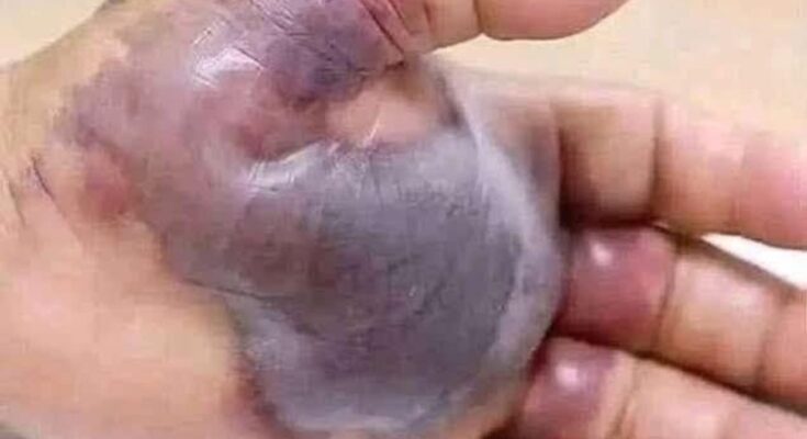 What started as a small sting turned into a horrifying medical emergency. This terrifying image shows a hand severely swollen and blackened—an advanced infection that spread rapidly within hours. Doctors believe it may have been caused by a spider or insect bite, or possibly an aggressive form of necrotizing fasciitis, also known as flesh-eating bacteria.